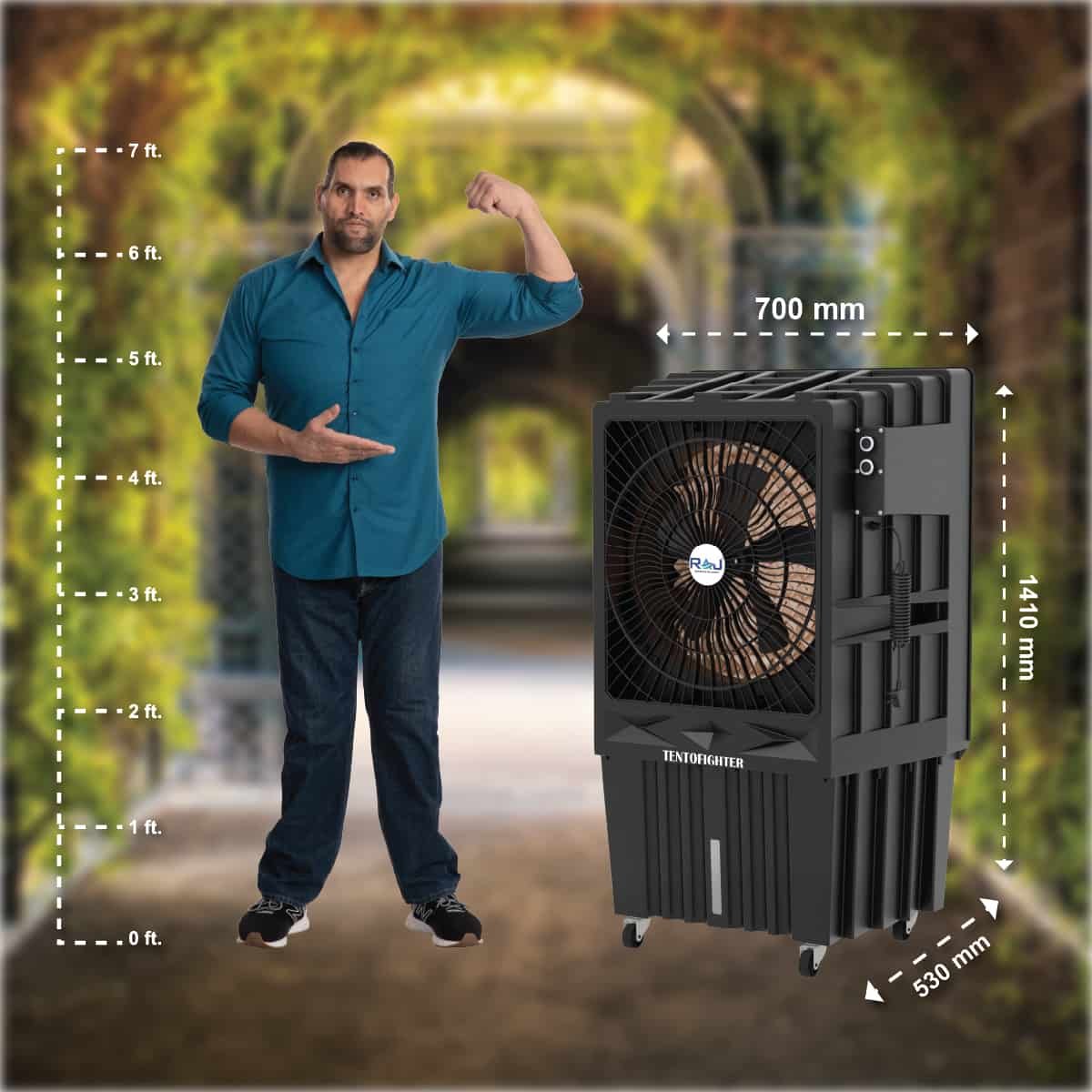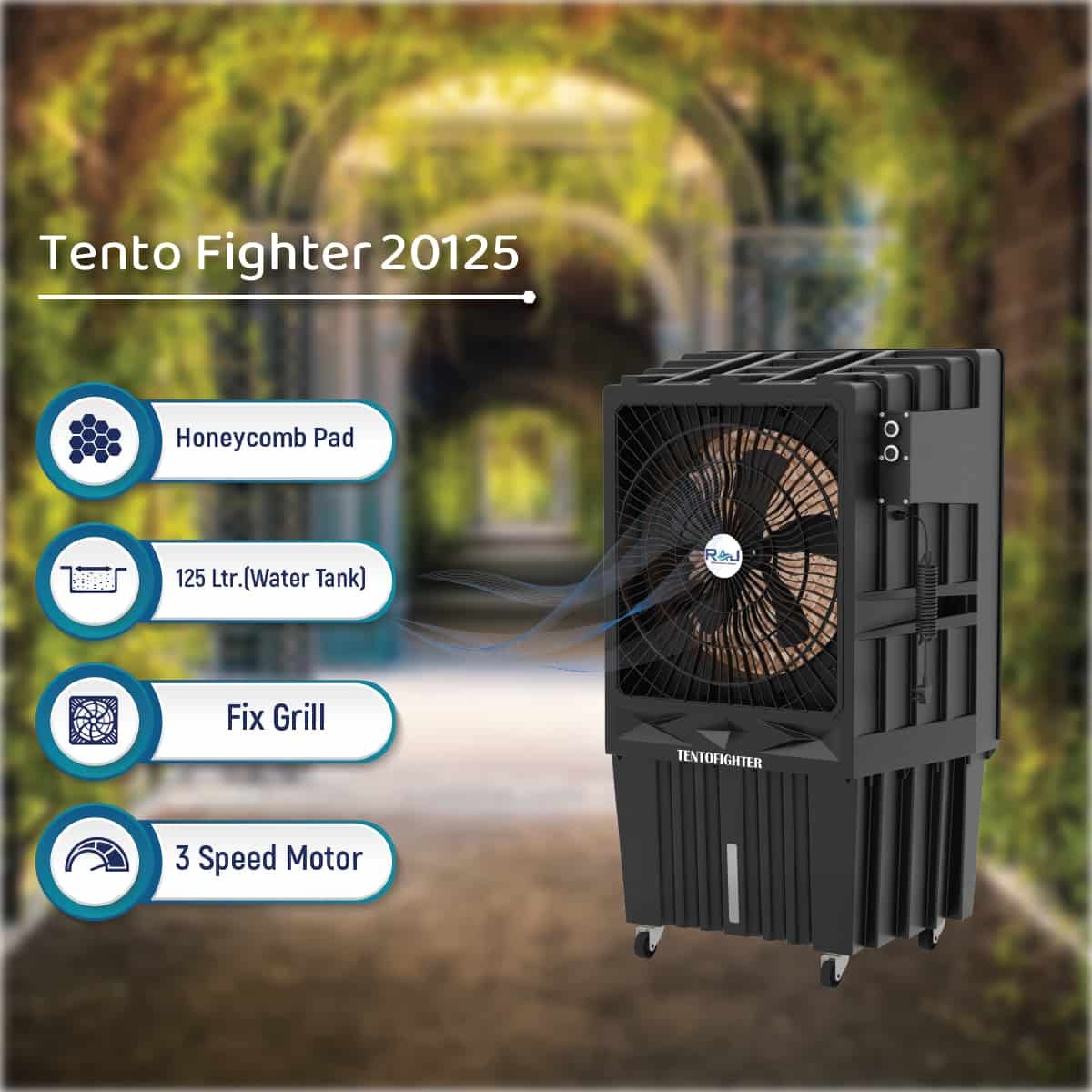 Introducing the TENTO FIGHTER 20 air cooler, designed for the tent industry. With a 3-speed motor, 125-liter capacity, and efficient 180W power consumption, it provides powerful, low-noise cooling at 1300 RPM. Perfect for outdoor settings, it ensures comfort in any tent environment.