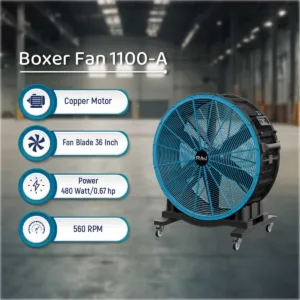 The BOXER FAN 1100-A is powered by a copper motor, offering superior conductivity and heat resistance compared to other motor types. With a 480W power rating and 0.67 Hp, it ensures a steady balance between energy consumption and performance. The copper windings add durability, making it suitable for long operational hours.