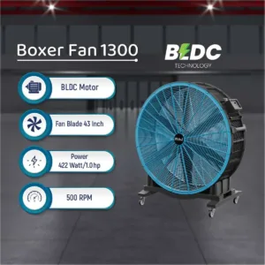 The BOXER FAN 1300 is built for spaces that demand strong and consistent airflow. Powered by a BLDC motor, this fan combines energy efficiency with durability, reducing power consumption without compromising performance. With a 240-watt motor generating 0.32 horsepower, it’s designed for both industrial and large commercial applications.