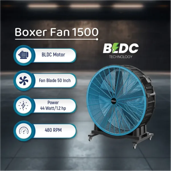 The BOXER FAN 1500 is designed to tackle the most demanding cooling needs in industrial and commercial environments. Its 440-watt BLDC motor delivers a strong 0.58 horsepower output, ensuring powerful airflow while maintaining energy efficiency. The fan is perfect for cooling large venues, workshops, or manufacturing areas.