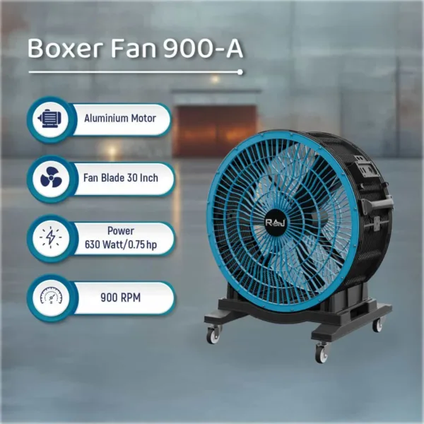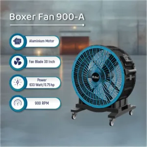 The BOXER FAN 900-A is particularly ideal for heavy-duty cooling applications with its heavy-duty aluminium motor to offer long-lasting performance. It is powered by 550 watts and has 0.75 horsepower capacity and is capable of generating heavy airflow while being energy efficient and commercially and industrially appropriate.