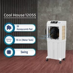 Break free from the limits of traditional air conditioners and enjoy the easy convenience of the Cool House(55 Ltr) Air Cooler. Compact and lightweight, it smoothly moves on sturdy wheels to bring cool air wherever you need it. Whether you’re cooling down a room or making your patio more comfortable, the Cool House(55 Ltr) is your go-to solution for staying cool.