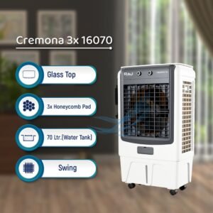 Equipped with a generous 70-liter water tank, the Cremona 16070 runs for long hours without the need for constant refilling. Its triple-layer honeycomb pads enhance water absorption and airflow, ensuring quicker and more effective cooling. The auto-swing feature distributes air evenly throughout the room, maintaining a balanced and refreshing environment.