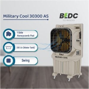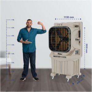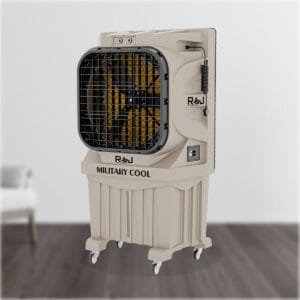 The MILITARY COOL AS 280 is a robust air cooler designed to cool expansive areas up to 2000 sq. ft. efficiently. With a powerful 30-inch axial fan and a 0.75 HP motor, it delivers strong airflow, making it ideal for warehouses, factories, and large commercial spaces.