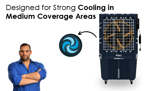The Rhombus 21125 AS is a robust air cooler built to handle intense heat in large areas like industrial halls, event venues, or open terraces. Its 50 ft. air throw and coverage of up to 1,400 sq. ft. ensure efficient cooling across expansive spaces. Powered by a 400-watt motor, it delivers steady, high-velocity airflow, providing dependable cooling exactly where it’s needed.