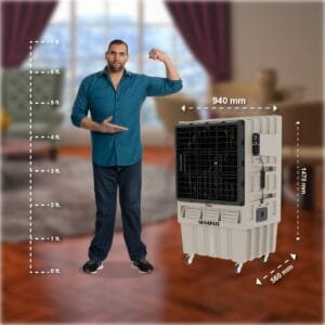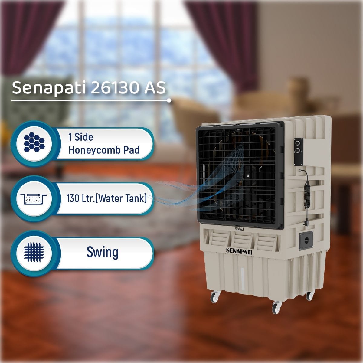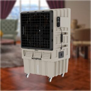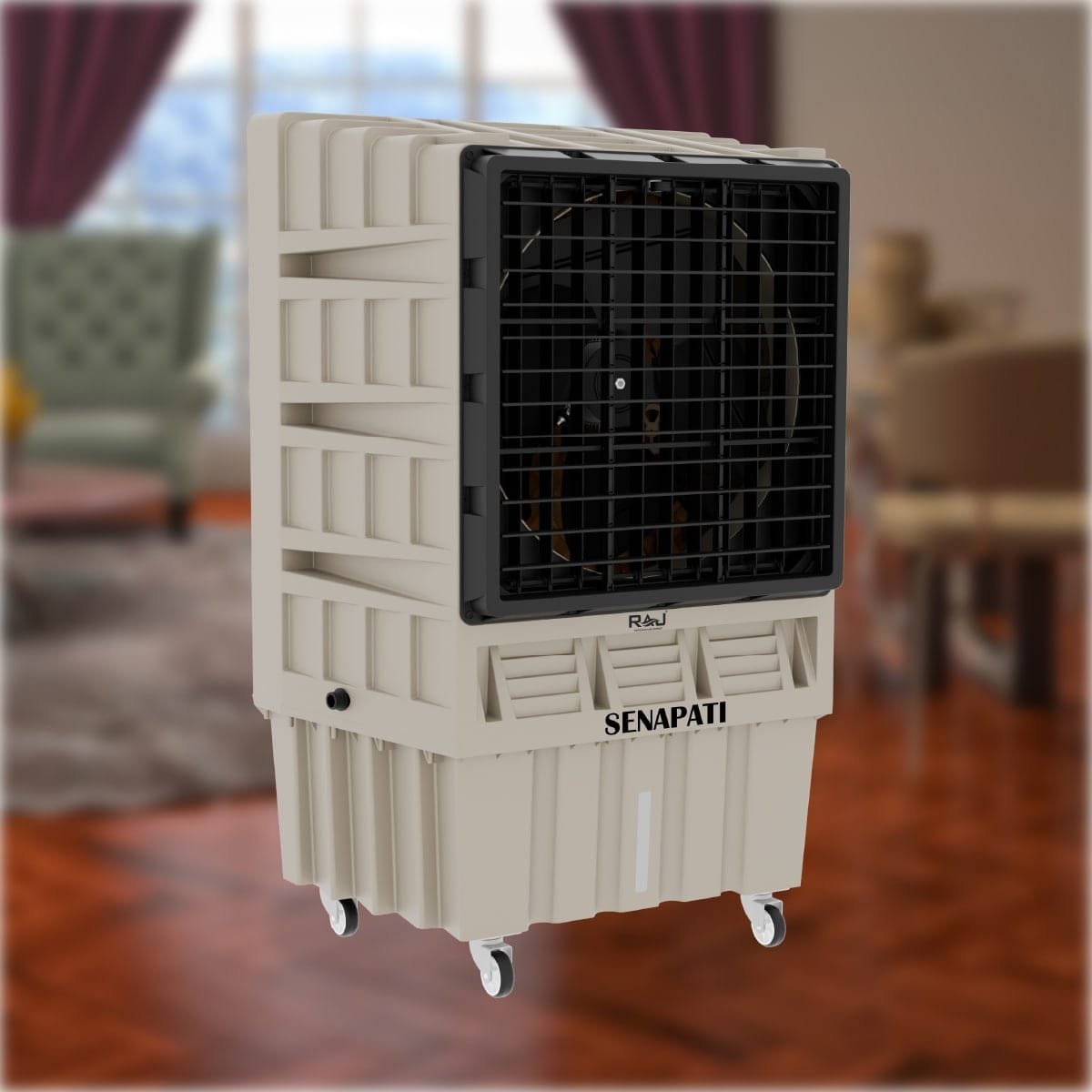 The SENAPATI AS 130 is a high-performance industrial air cooler designed for large areas up to 700 sq. ft.. With a 120L water tank, 0.65 HP motor, and 500W power consumption, it ensures powerful and efficient cooling. Its rugged design makes it ideal for factories, warehouses, and outdoor events.