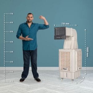 The axial fan design reduces noise levels, creating a tranquil environment while delivering refreshing air. Featuring a capacity of 190 litres and covering an area of 3000 square feet, this air cooler is designed to meet the cooling requirements of industrial settings.